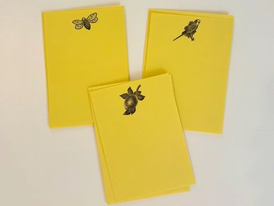 Set of 6 yellow petite letterpress flat notecards with matching envelopes. Please specify in the notes if you'd like a mix of all 3 designs or only the lemon, bee or parrot.
