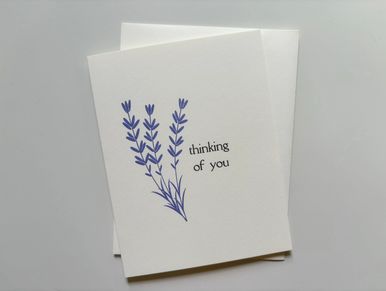 Letterpress printed thinking of you with a lavender sprig note set. Set 6 folded cards and envelopes.